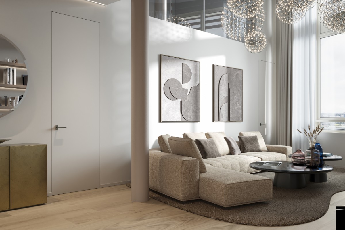 L’ingresso si apre su una zona living luminosa e scenografica, arricchita da ampie vetrate a doppia altezza che regalano una vista mozzafiato sui giardini di CityLife.