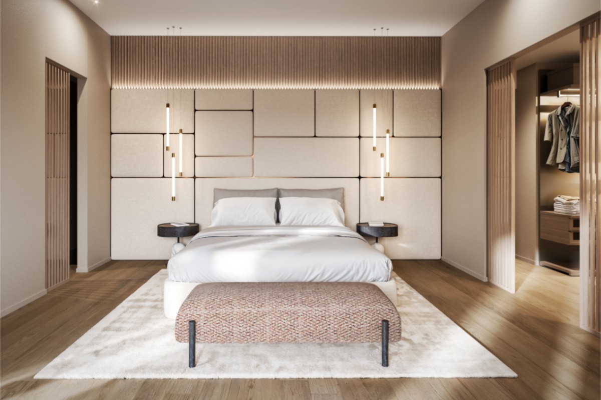 Una camera matrimoniale con bagno en suite e armadiature su misura.