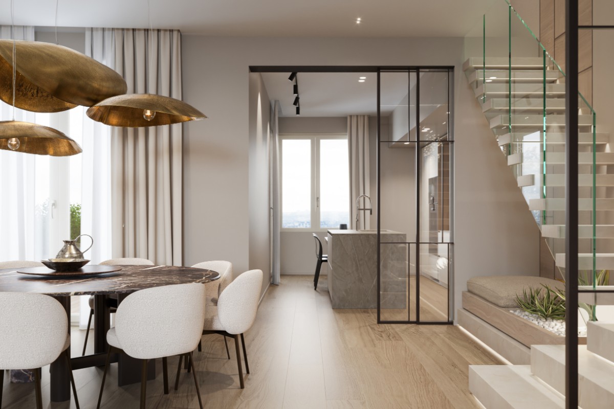 Distribuita su due livelli, questa prestigiosa residenza è caratterizzata da materiali sofisticati, arredi su misura e spazi pensati per offrire un'esperienza abitativa raffinata e contemporanea.