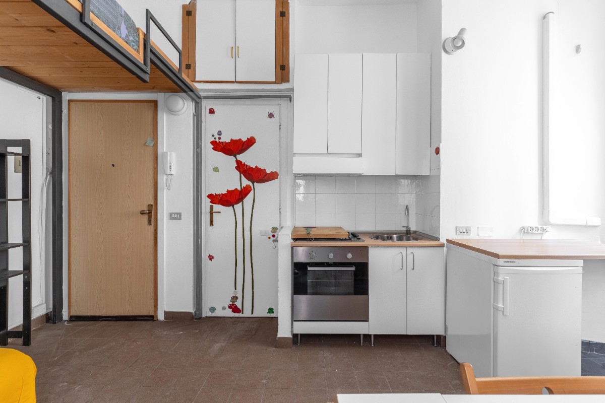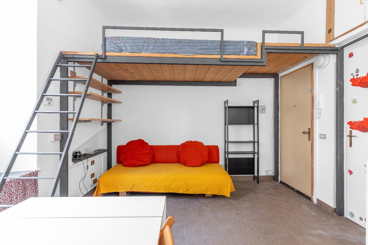 L’ambiente è organizzato in modo funzionale: la zona giorno con angolo cottura offre uno spazio pratico e luminoso, mentre il soppalco crea una zona notte raccolta e ben separata. Completa la proprietà un bagno con doccia.