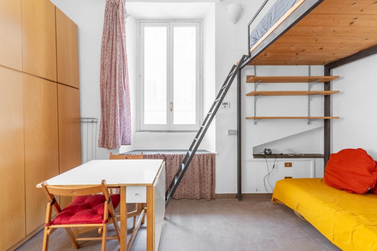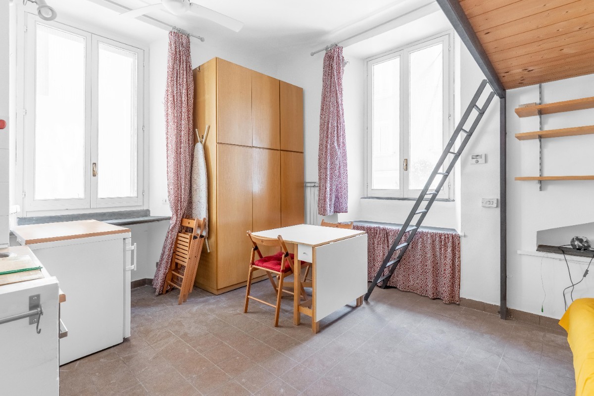 L’ambiente è organizzato in modo funzionale: la zona giorno con angolo cottura offre uno spazio pratico e luminoso, mentre il soppalco crea una zona notte raccolta e ben separata. Completa la proprietà un bagno con doccia.